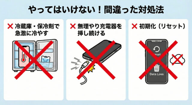 ネット上には「iPhone 高温注意 直し方」として様々な情報が溢れていますが、中には状況を悪化させる危険な方法も含まれています。特に「熱くないのに警告が出る故障」の場合、以下の行為は致命的です。